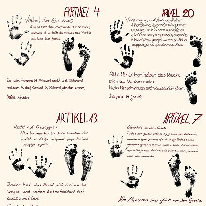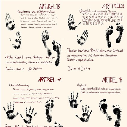 In unseren Kanzleiräumen wurde eine aufregende Diskussionsrunde geführt, in der auch kritische Aspekte bei der Umsetzung der Menschenrechte beleuchtet wurden. Um die Wichtigkeit der Menschenrechte visuell in das Gedächtnis der Menschen zu rufen, gestalteten die Schüler riesige Banner, auf denen sie die Menschenrechte in ihren Muttersprachen niederschrieben und Hand- und Fußabdrücke fertigten.