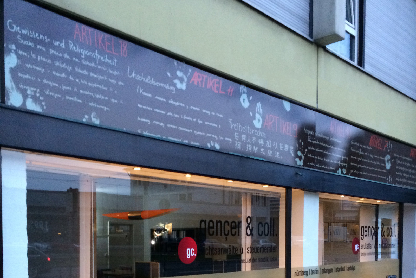 Nach dem Umzug der Kanzlei an den neuen Standort in der Parsifalstr. in Nürnberg sowie die Eröffnung der Zweigstelle in der Regensbuger Str. wurde dort ein entsprechendes neues Banner gestaltet, um das Projekt weiter leben zu lassen und auf die Wichtigkeit des Projektzwecks hinzuweisen.